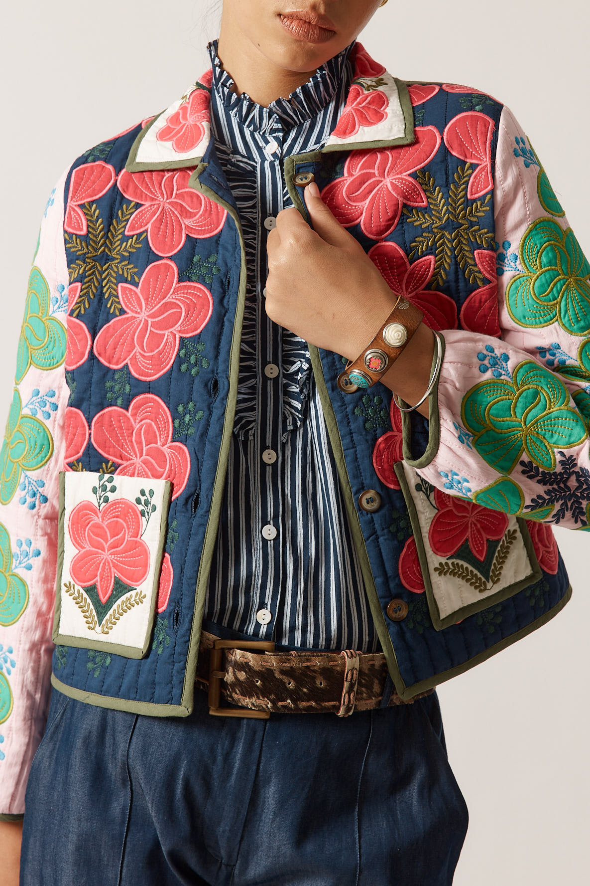 Made from 100% cotton, this quilted jacket featuring colourful patchwork, intricate embroidery, and a relaxed, bohemian aesthetic designed for effortless styling