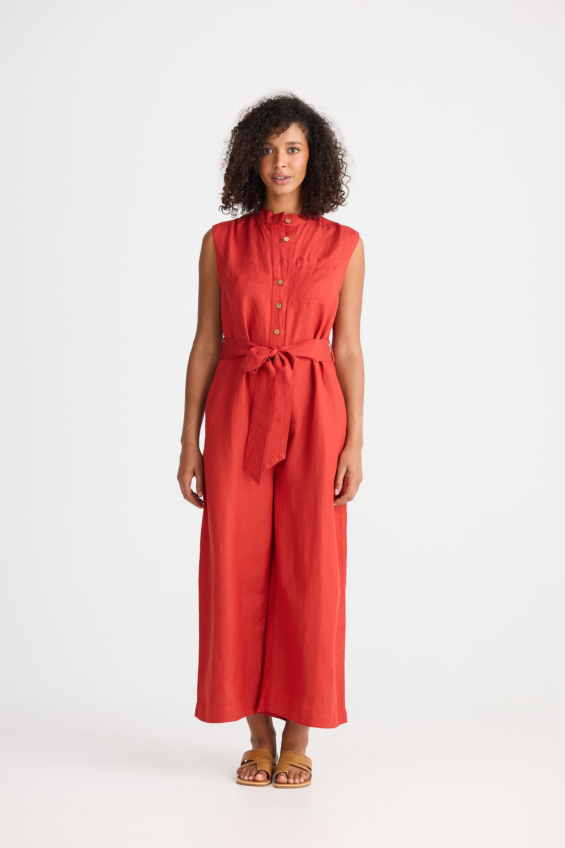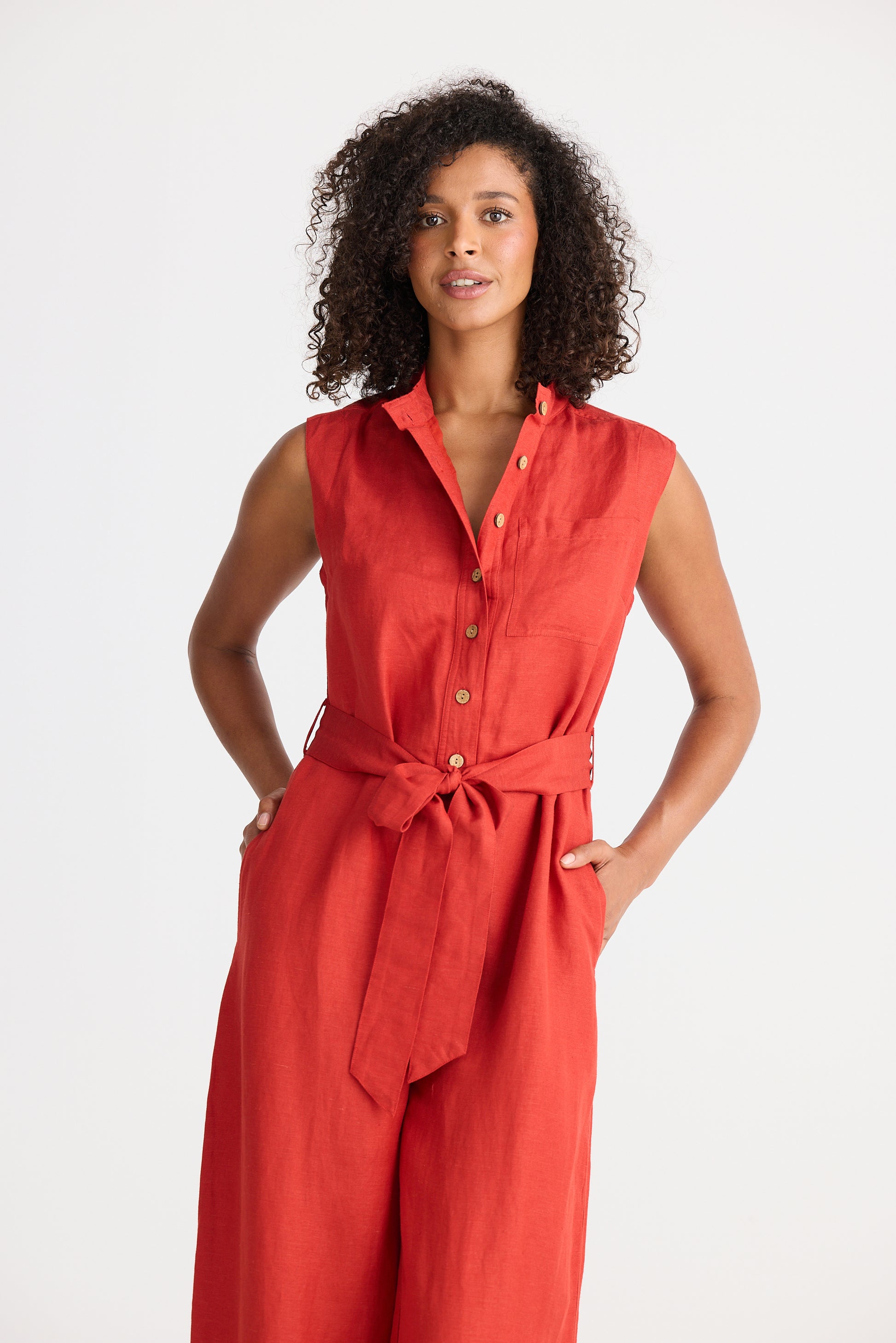 Effortless style meets everyday comfort in the Shanty Isola Jumpsuit. Crafted from a soft linen-viscose blend, this sleeveless design features a band collar, button-down front, and a relaxed wide-leg silhouette. A removable waist tie allows you to define your shape, while side and chest pockets add a touch of utility. In a bold Cherry hue, it’s a standout piece that transitions easily from day to night.